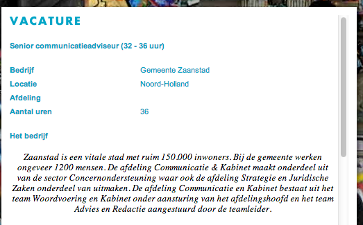 De afdeling is bezig met een professionaliseringsslag van de communicatie van de organisatie en de eigen werkwijze. Producten en diensten van de afdeling moeten op strategisch niveau worden gebracht. (vacature)