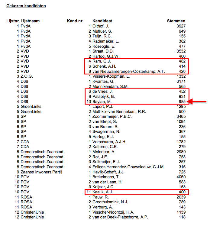 Bij D66 hebben Martin Hoek (3), Wouter Zorg (4) en Flip Hoedemaker (5) een vervelend telefoontje van lijsttrekker Gemma Kwantes gekregen. Zij zijn voorbijgestreefd door Bahar Palabiyk (6) en Murat Baylan (13). De laatste haalde de meeste voorkeurstemmen (985) in Zaanstad.