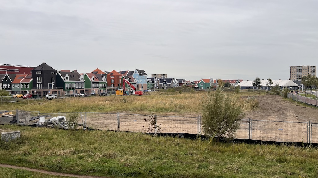 Na negen jaar plannen lijkt er nu eindelijk een beetje beweging te zitten in het Stelling/Heldin-plan. Het gaat om de plek waar vroeger het belastingkantoor aan de Houtveldweg (Westerwatering, Zaandam) stond. Er moeten 449 appartementen komen. Wij zagen bij het langsfietsen een dragline* op het terrein (en dat zou wel eens voor voorbereidend grondwerk kunnen zijn).