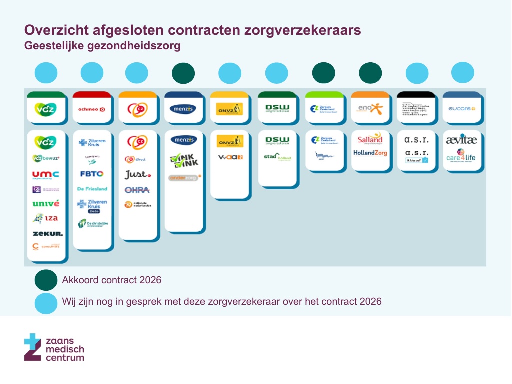 Voor geestelijke gezondheidszorg ontbreken nog de meeste contracten. Ook met de grote partijen Achmea, VGZ en GZ is nog geen overeenkomst. Alleen met Menzis, ENO en Zorg & Zekerheid is een contract.