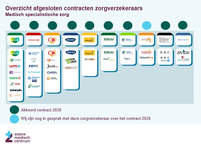 Het Zaans Medisch Centrum (ZMC) heeft met vrijwel alle verzekeraars voor specialistische hulp contacten afgesloten voor het jaar 2026. Alleen met ENO – waar ook Salland Zorgverzekeraar en Holland Zorg onder vallen -, is nog geen contract.