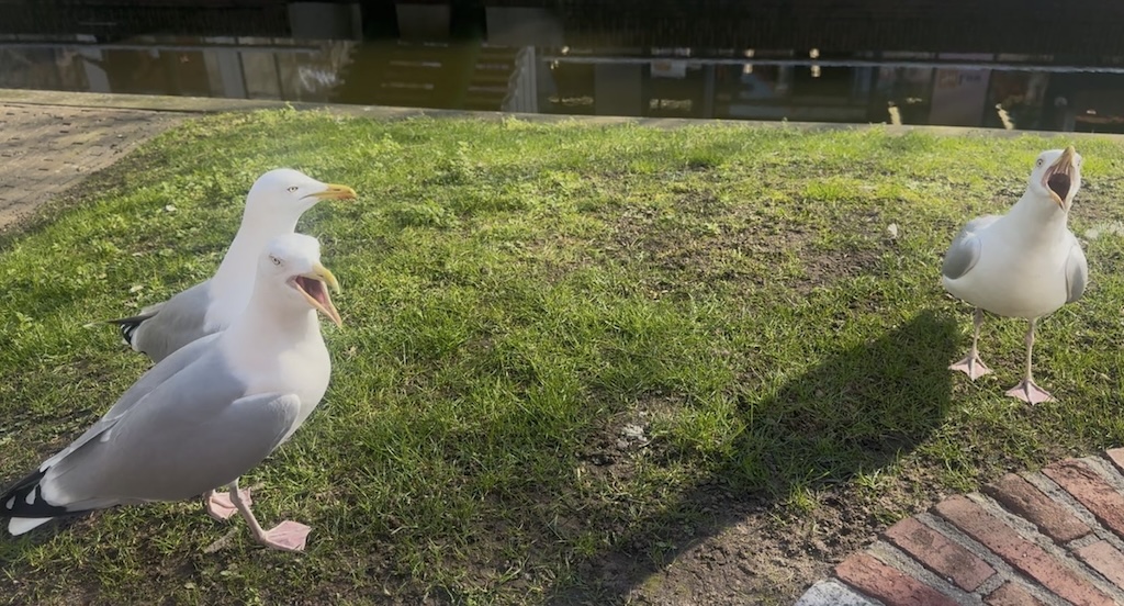 De hangmeeuwen op de ontdempte Gedempte Gracht houden weinig rekening met hun omgeving. Ze roddelen erop los en zetten soms een grote snavel op naar winkelend publiek of naar elkaar.