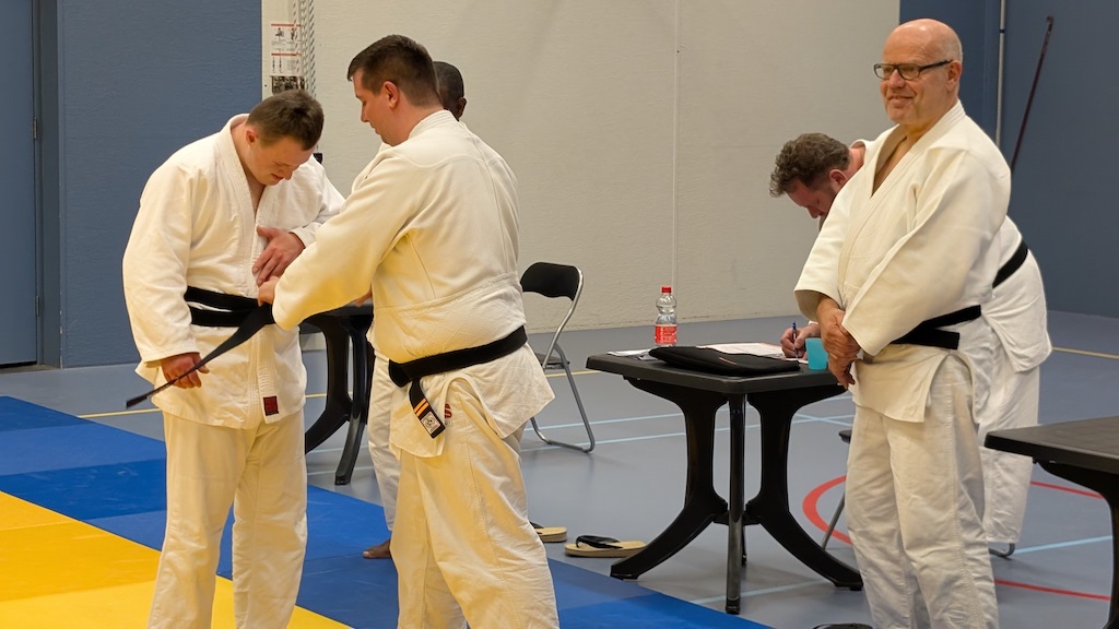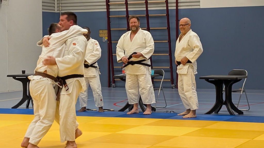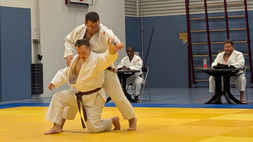Na een korte drinkpauze is het tijd voor nog wat staande technieken. ‘Thom gaat bij jou een worp inzetten en dan ga jij hem overnemen’. Hup, daar gaat Thom weer door de lucht. Het examen eindigt met grondtechnieken. Houtgrepen, worstelingen en elke keer brengt Michel het er grandioos vanaf. Dat ziet ook de jury, die slechts een kort beraad nodig heeft voor het eindoordeel.